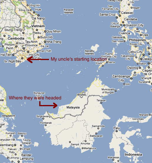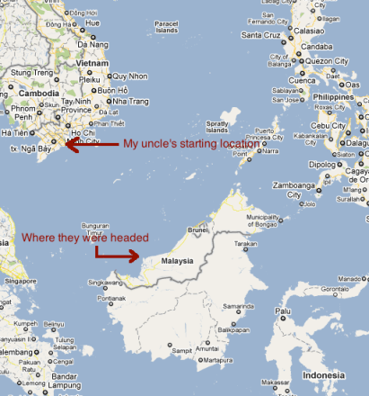 They were along side for three days until they lost patience and started climbing up the rig. It was very dangerous, and he said the people on the rig eventually threw down ladders and helped them up. They were fed western food and taken to a refugee camp in Malaysia. It had been one week since my uncle began his journey.
