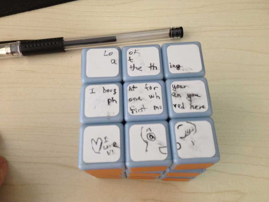 Before I head out the door, I put a little sign on the drawers next to the bed that says “Look inside baby!” Opening the drawer, she’ll find a rubik’s cube that she has to solve.